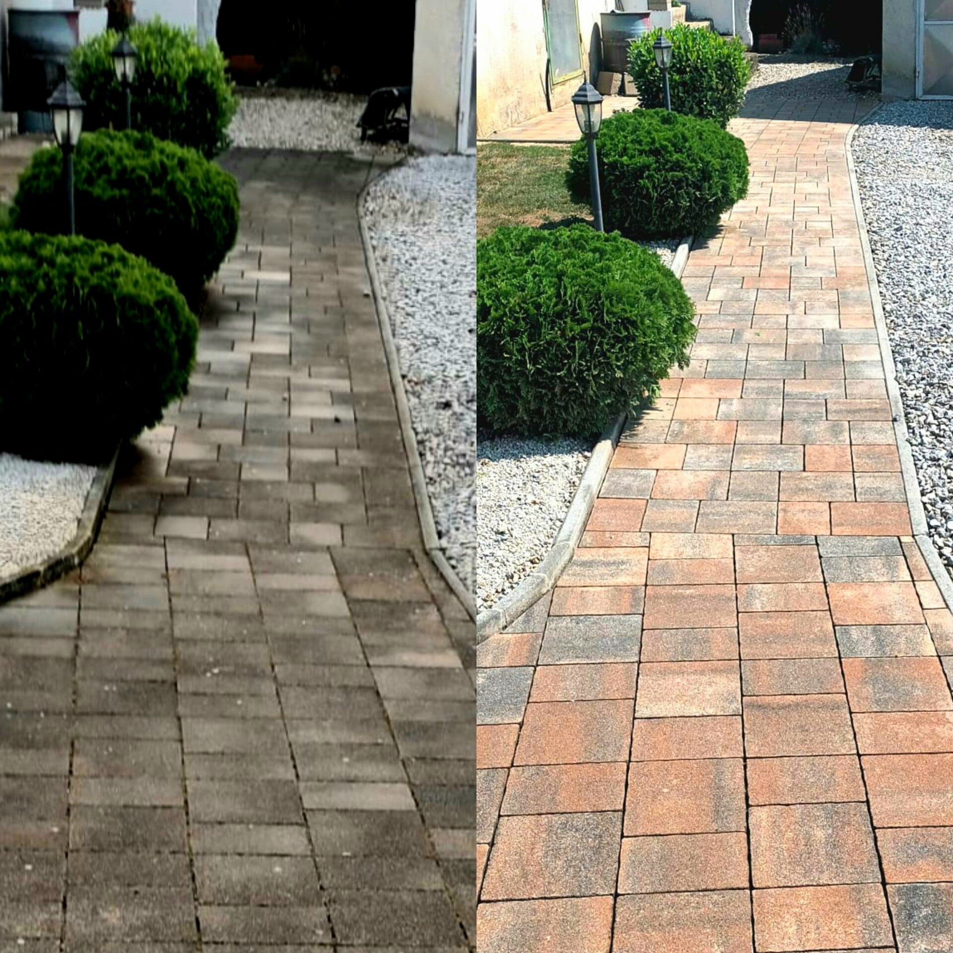Visokotlačnim pranjem uklanjamo mahovinu, alge, prljavštinu i tvrdokorne naslage s vaših pločnika, samim tim se vraća izvorni izgled na vašim stazama, terasama i prilazima. Korištenim kvalitetnih sredstava postižemo bolje rezultate izgleda i zaštite. Nakon pranja fuge popunjava kvarcnim pijeskom.